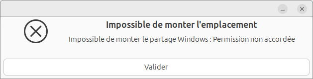 Si un message indique l'impossibilité de monter l'emplacement lorsque l'on veut accéder au dossier partagé à partir du réseau (comme sur l'illustration ci-contre), c'est qu'il y a un problème de droits d'accès. Le message n'est pas très explicite et peut être déroutant. Dans l'exemple ci-dessus, le dossier Images est partagé. Il est situé dans /home/rene/Images dans l'arborescence des dossiers. Pour y accéder, il faut accéder successivement au dossier home, puis au dossier rene. Or dans ces distributions les droits de notre dossier personnel (rene dans notre exemple) empêchent les autres utilisateurs d'accéder à ce partage. Il faut donc modifier ces droits :
